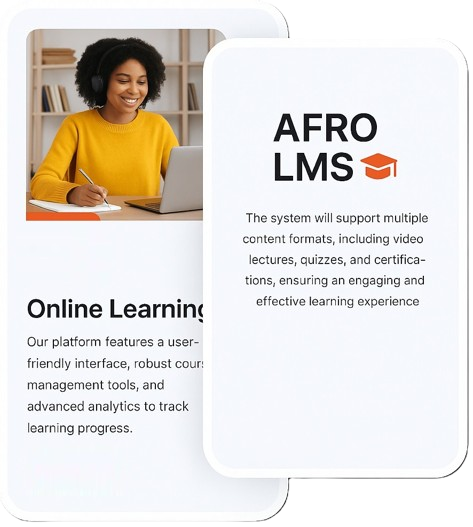 AFRO LMS will feature a user-friendly interface, robust course management tools, and advanced analytics to track learning progress. The system will support multiple content formats, including video lectures, quizzes, and certifications, ensuring an engaging and effective learning experience